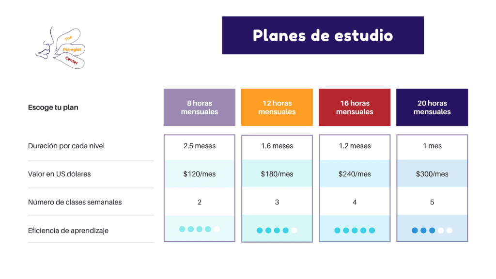 A continuación, te presentamos nuestros planes de estudio con su respectiva carga horaria semanalmente y mensualmente. Ten en cuenta que cada clase dura 60 minutos (exceptuando las clases del plan básico) y que puedes comprar cualquiera de los planes a continuación haciendo pagos mensuales. Puedes escoger el plan de estudio que más se adapte a tu disponibilidad horaria: